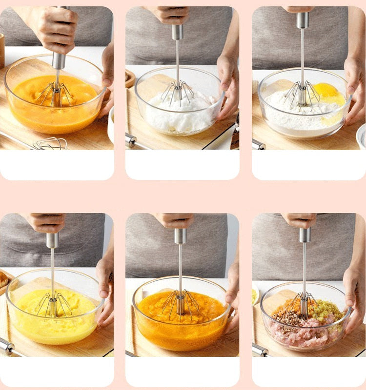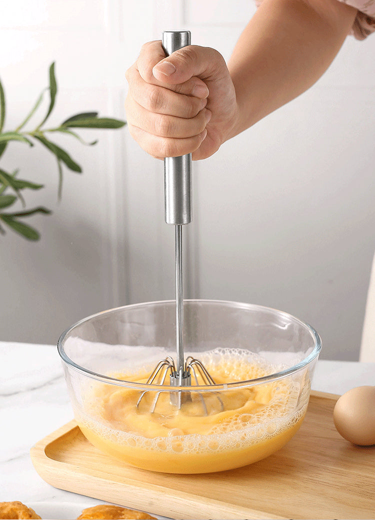 Este batidor cuenta con un mecanismo rotatorio automático, activado con solo presionar el mango hacia abajo, haciendo que las varillas giren por sí solas. Está fabricado en acero inoxidable resistente y duradero, apto para lavavajillas y libre de BPA.