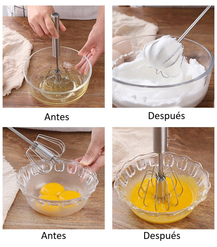 Gracias a su funcionamiento manual con rotación automática, no necesitas electricidad ni baterías para obtener mezclas suaves y homogéneas. Es ideal para quienes cocinan a diario y buscan una solución rápida, limpia y efectiva.