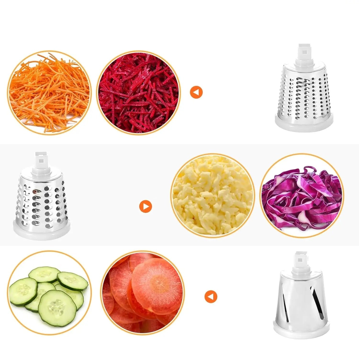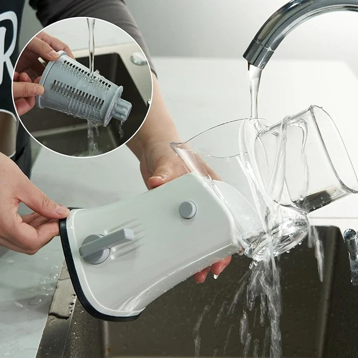 Con sus cuchillas de acero afiladas y resistentes, puedes rallar, cortar o laminar distintos tipos de alimentos sin problemas. Ya no necesitarás múltiples utensilios, este dispositivo lo hace todo con un simple movimiento giratorio.